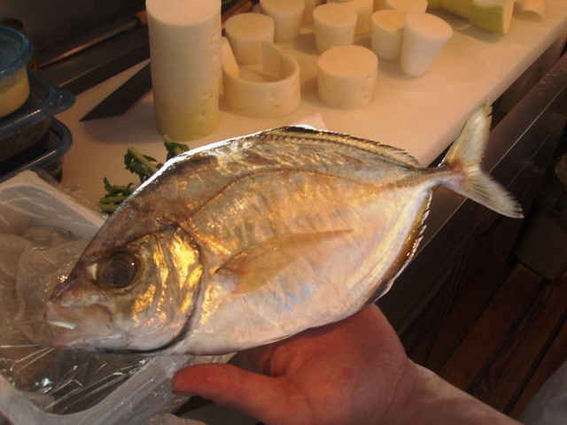 この魚。カイワリと言います。うろこの色がとてもきれいです。お刺身で頂いて下さい。他にも今日はミズヒキ・真鯛・カンパチ・アオリイカ・アジ・太刀魚・あわびがおすすめですよ!!