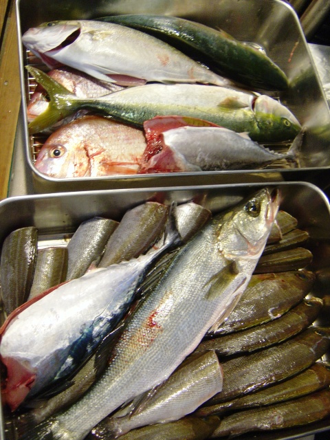 こちら!!カンパチ・いさき・セイゴ・真鯛、イナダです。今日獲れたての地魚の群れです。