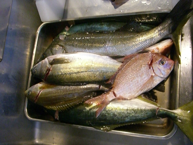 写真左:平鯵/右:花鯛、イサキ、セイゴ、イナダ‥地魚が一杯