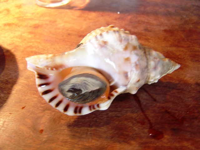 ホラ貝です。戦国時代などの合戦ものにはつきものの、”あの”笛に変わるホラ貝です。