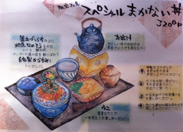 中にはまかない丼のベースである地魚で作ったなめろう(数種類の魚と無添加吟醸味噌で和え、上から秘伝のゴマだれがかけてある)に釜揚げしらす、錦糸たまご、香ばしく炙られた魚の皮、いくら、自家製のからすみ、キャビア、うにがこの上なくマッチします。