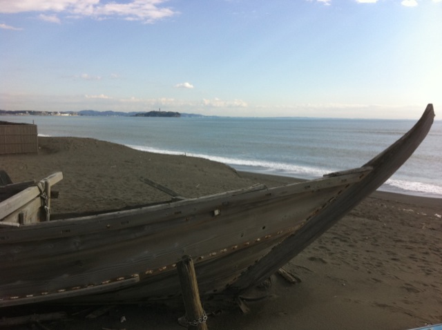 これから年末になれば飲む機会も多くなります。飲むのは楽しいものですが、ついつい飲み過ぎてしまい二日酔いなんてこともしばしば・・・。飲み過ぎた次の日は汗を流すに限ります。体をリフレッシュさせるべく歩いていると、なんと茅ヶ崎の浜に役目を終えた漁船を発見!!