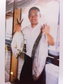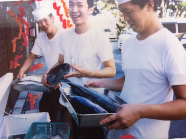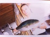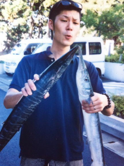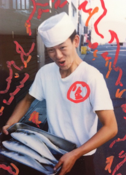 『ワカシ(ブリの子供)とワタシ。いい魚が入ると、思わず♥に火がつきます。